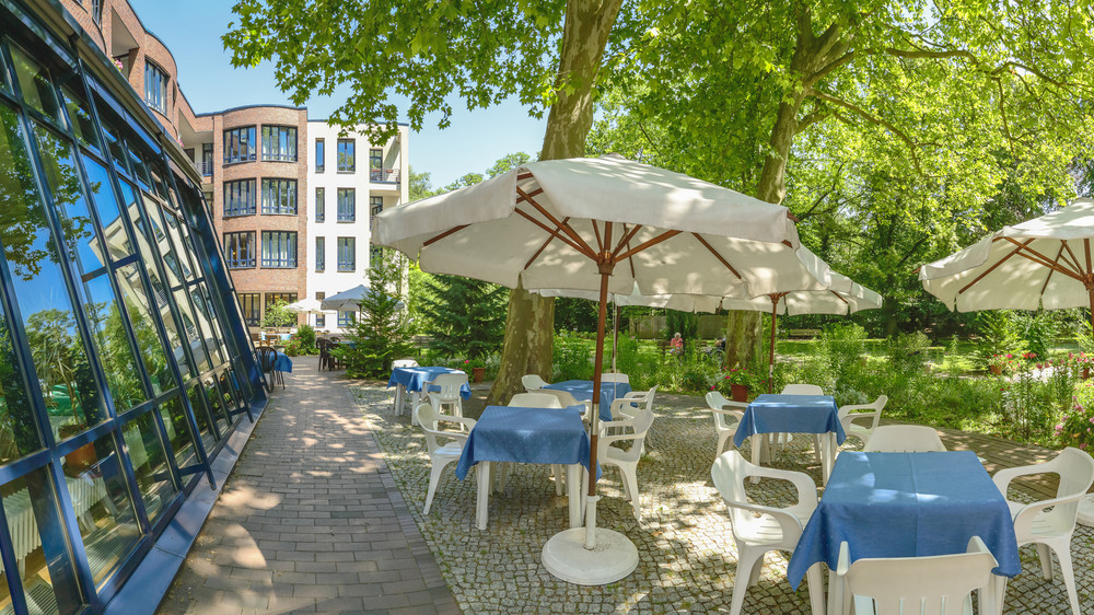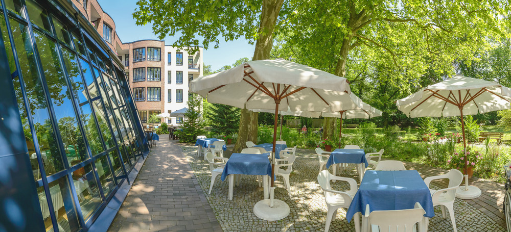 Naturliebhaber schätzen den großzügig angelegten Park mit seinem alten Baumbestand. Sitzgelegenheiten gibt es auf der Sonnenterrasse und im Park unter den schattenspendenden Platanen. Abwechslung bringt auch ein Bummel auf der nahe gelegenen Leonorenstraße mit seiner Gastronomie und den vielen Geschäften.